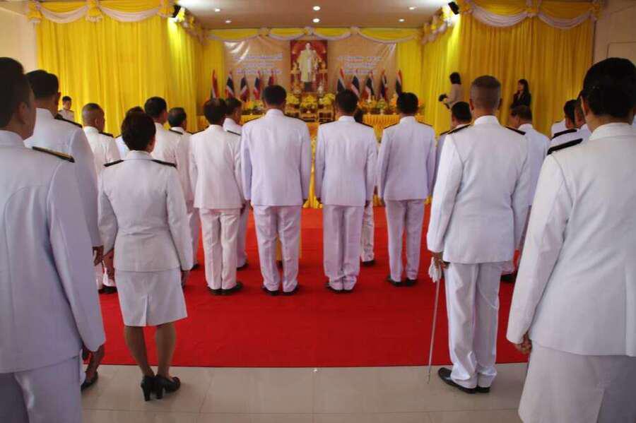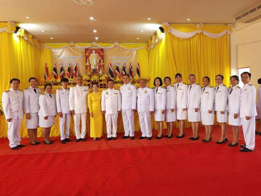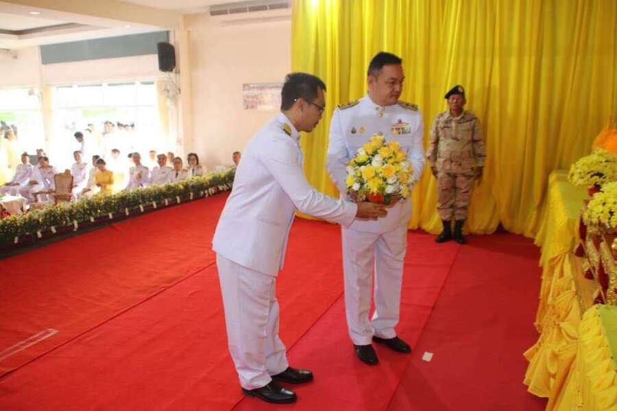 ผู้บริหาร คณะครู ร่วมพิธีถวายพานพุ่มดอกไม้และถวายบังคมเนื่องในวันพ่อแห่งชาติ ณหอประชุม ที่ว่าการอำเภอวาริชภูมิ S:0