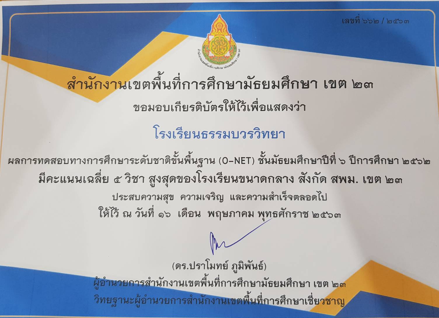 ขอแสดงความยินดี ผลคะแนนเฉลี่ย o-net ม.6 *สูงสุดของโรงเรียนขนาดกลาง สพม.23