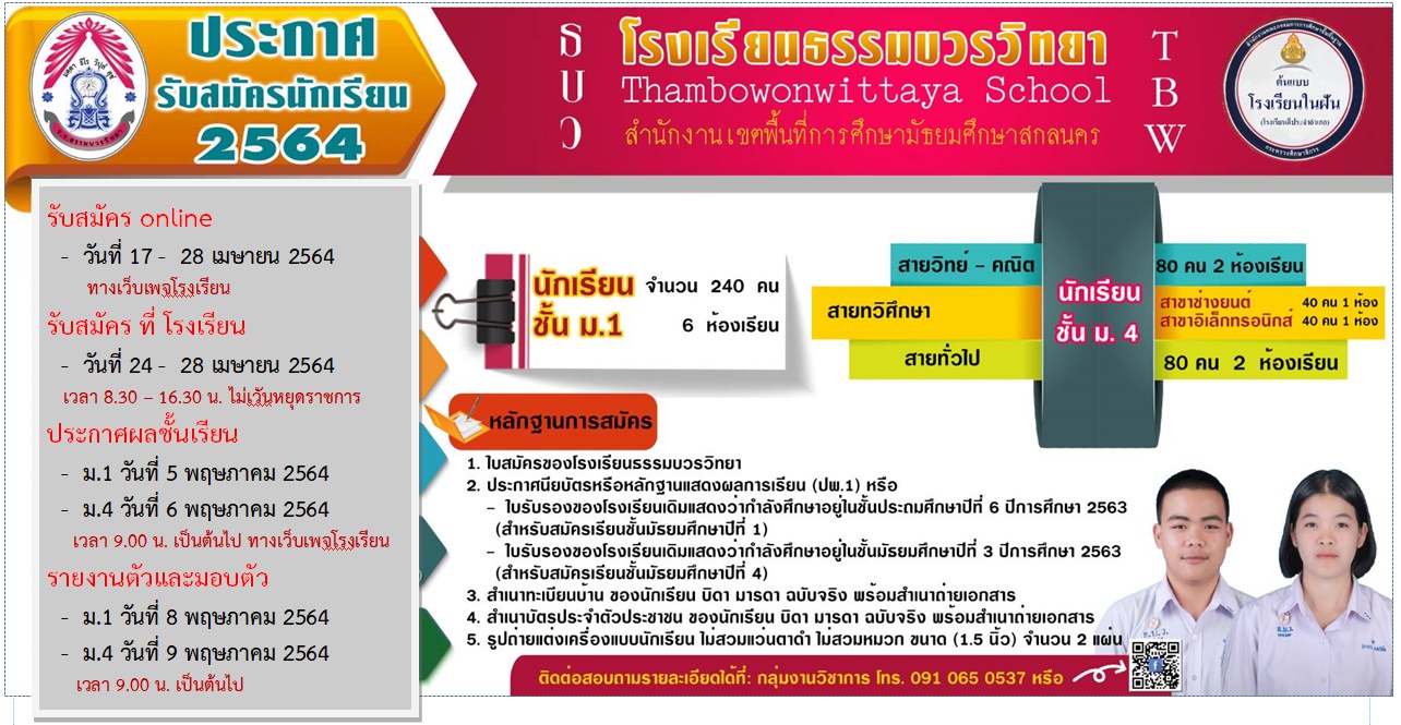 รับสมัคร ที่โรงเรียน เริ่ม 24 - 28 เมษายน 2564