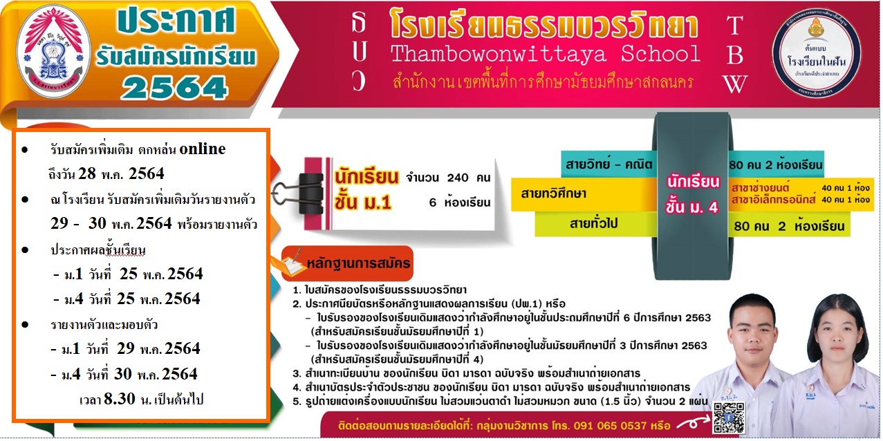 สำหรับนักเรียนที่สมัครเรียนไม่ทัน หรือรายชื่อตกหล่น ทางโรงเรียนยังเปิดรับสมัครเข้าศึกษาต่ออยู่นะคะ สำหรับนักเรียนคนใดที่อยากสมัครเรียนสามารถติดต่อที่เบอร์ คุณครูทัศนีย์ วงศ์ประทุม หัวหน้ากลุ่มบริหารงานวิชาการ 0879468649 หรือสามารถมาสมัครด้วยตัวเองในวันที่ 12-13 พฤษภาคม 2564 นะคะ????