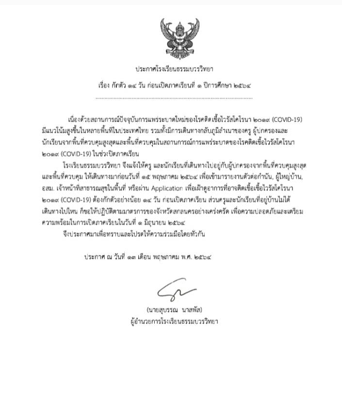 แจ้งคณะครูบุคลากรทางการศึกษาโรงเรียนธรรมบวรวิทยา ขอความร่วมมือปฎิบัติตามมาตราการสำนักงานเขตพื้นที่การศึกษามัธยมศึกษา สกลนคร สถานการณ์ โควิด