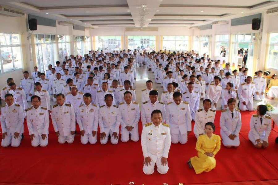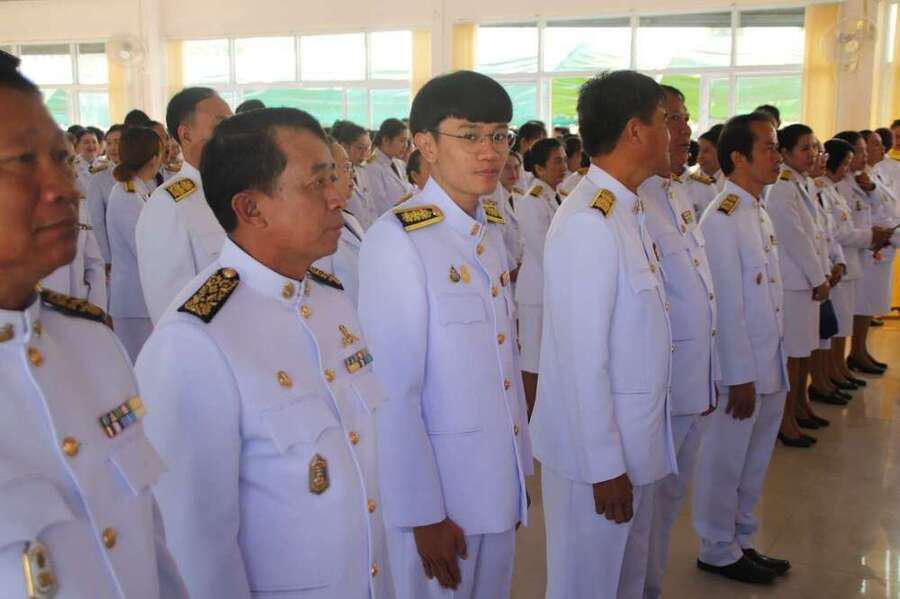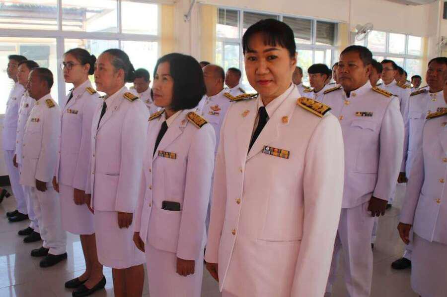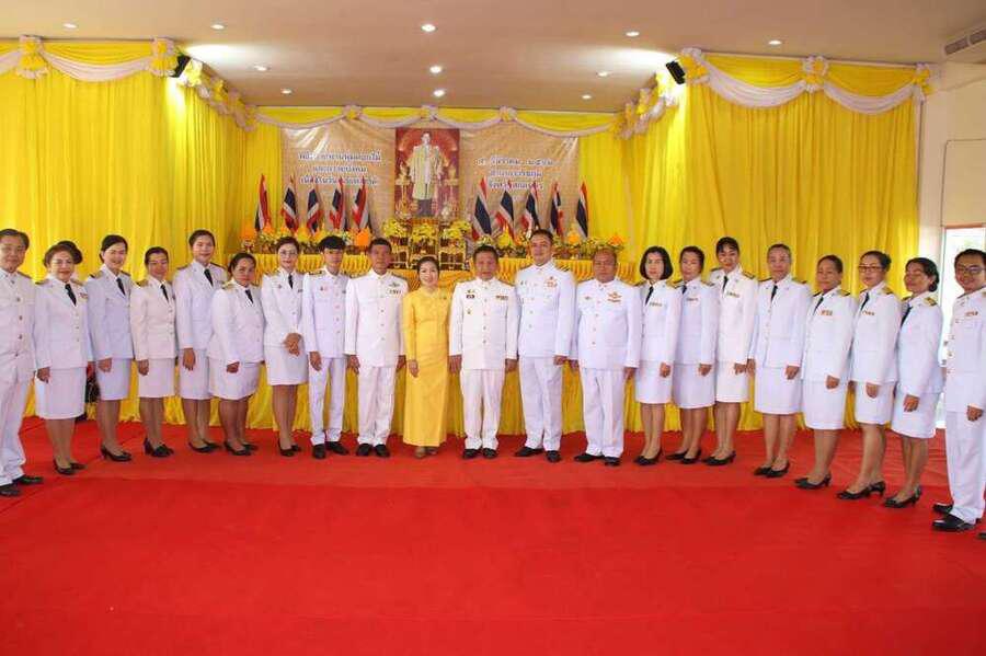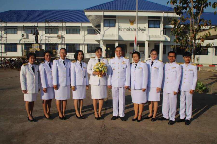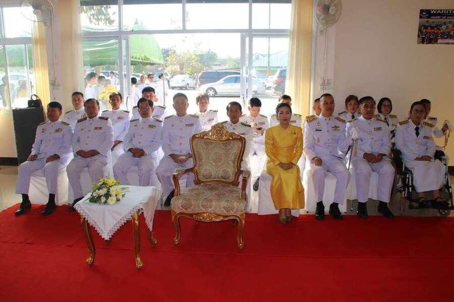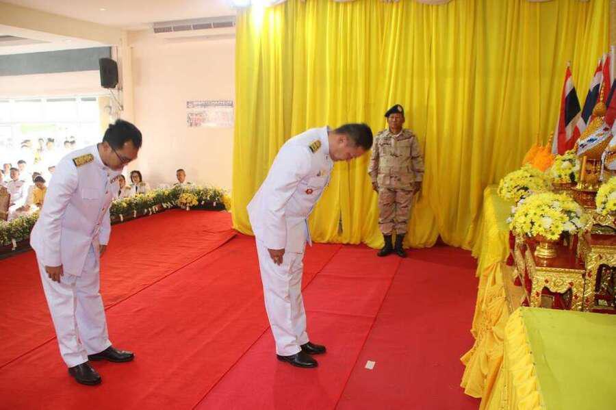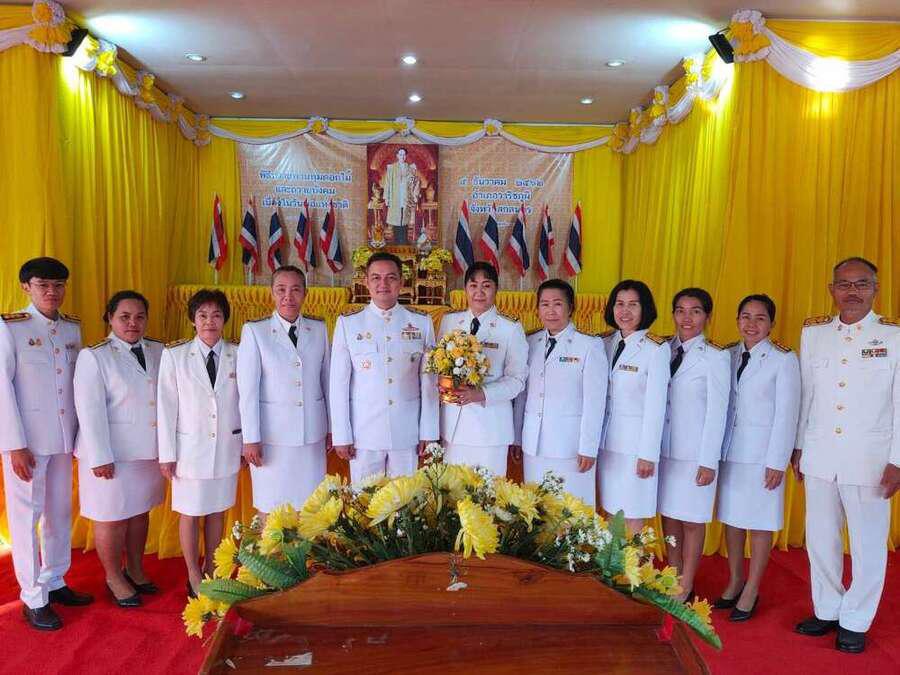 ผู้บริหาร คณะครู ร่วมพิธีถวายพานพุ่มดอกไม้และถวายบังคมเนื่องในวันพ่อแห่งชาติ ณหอประชุม ที่ว่าการอำเภอวาริชภูมิ S:0